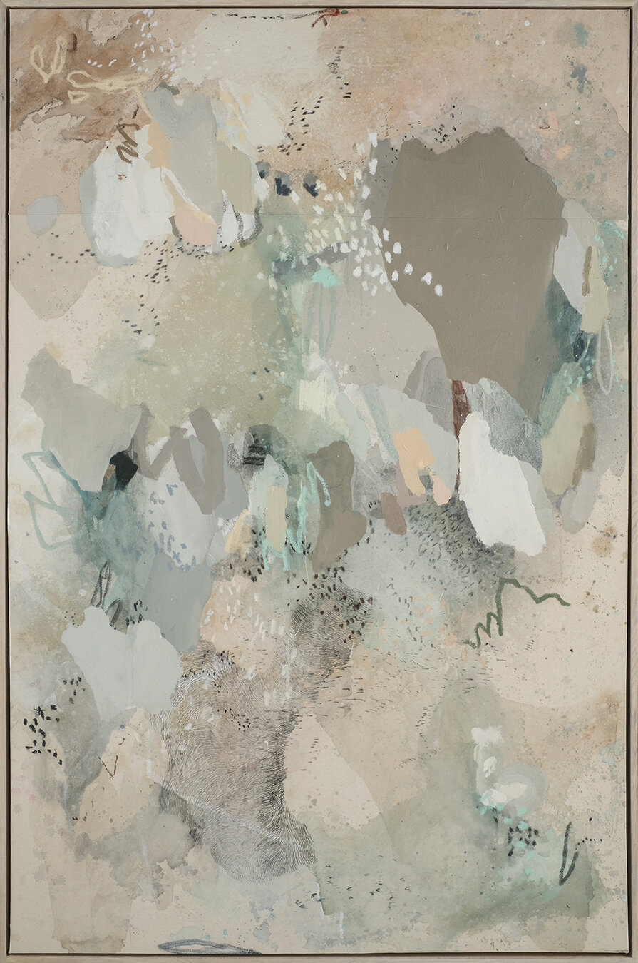In chasing the idea of flow, I set off with unlimited parameters. This meant throwing paint, drawing thoughtlessly, and ripping canvas. A lot of paintings were made and ruined in the making of these final nine paintings. While making my last series “Story of a Girl”, I implemented cutting and sewing as a method of collage to transform the composition. Now comfortable with this technique, I often pulled it to my repertoire, and used cutting and sewing in this series. But instead of focusing on the compositional elements, I used it as a way to destroy and rework parts of a painting that weren’t working.