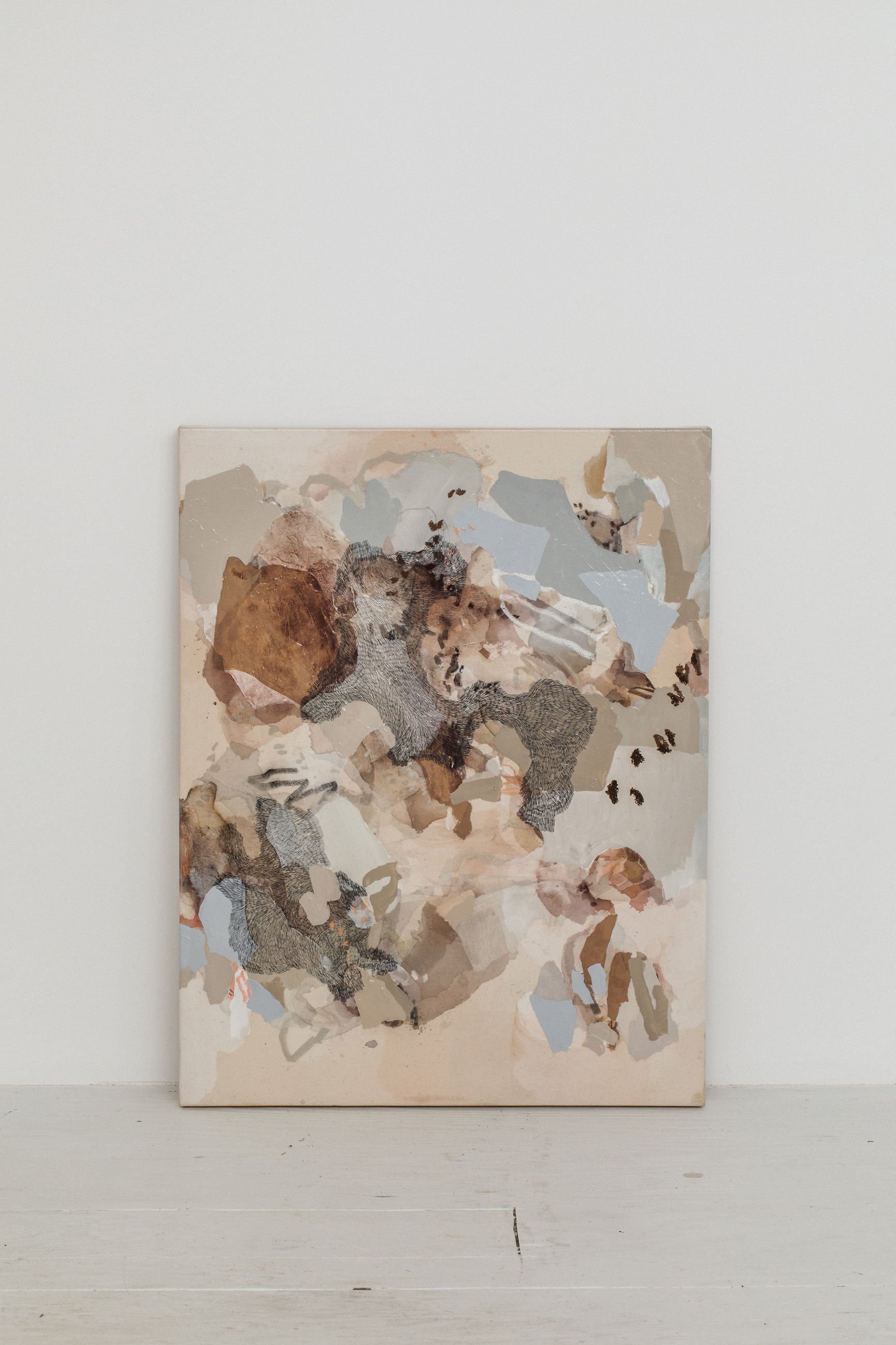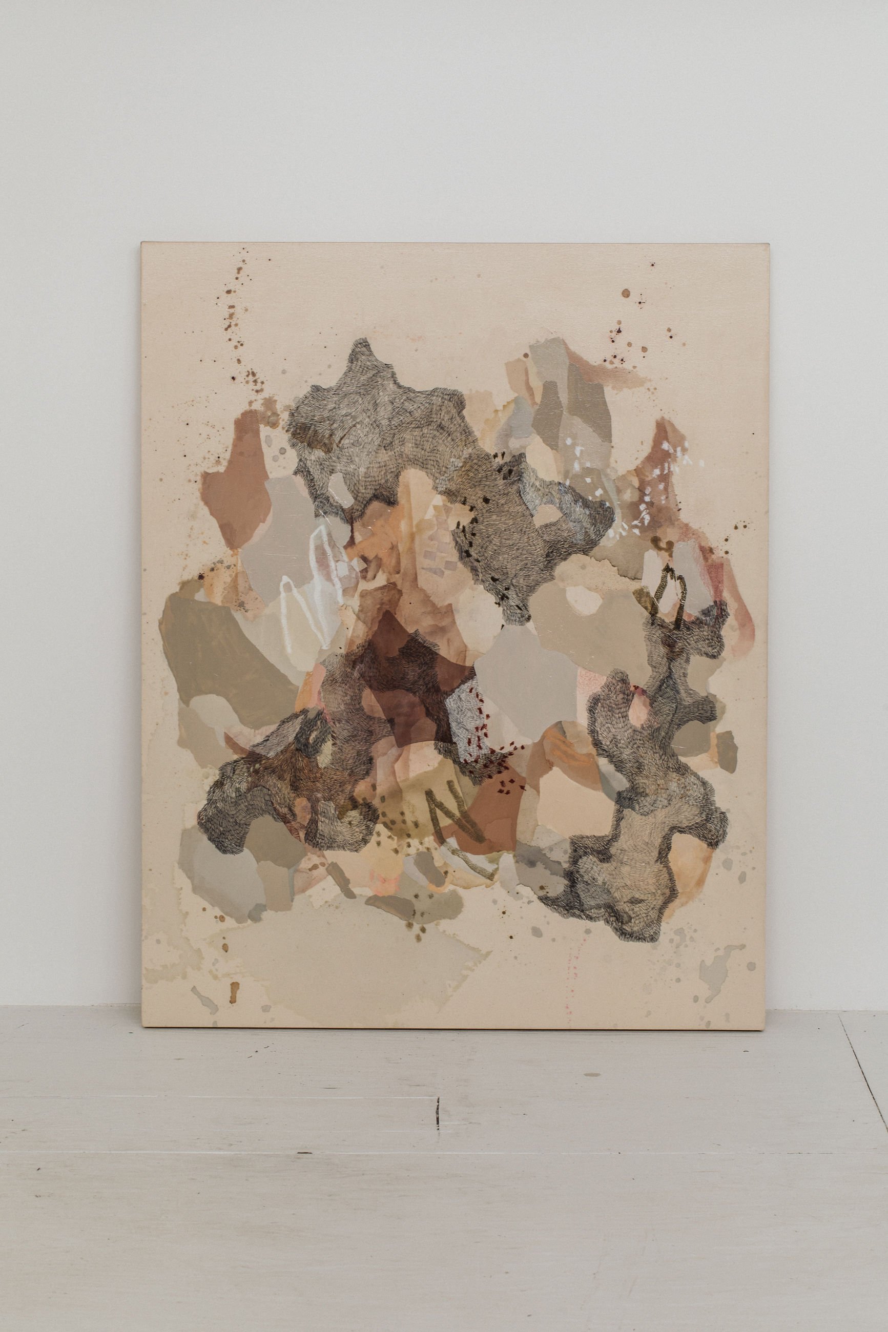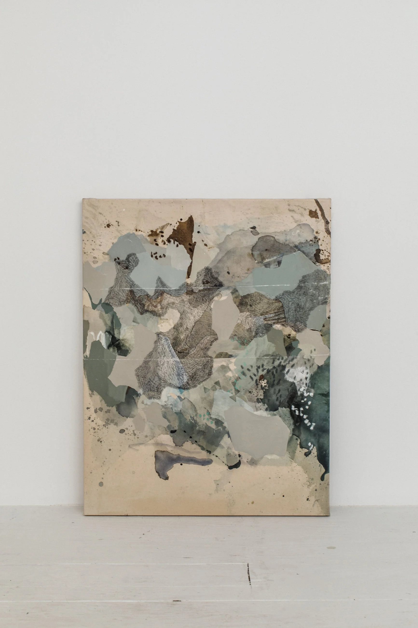 I wanted these abstract paintings to infiltrate you into their own imagined worlds. Visual devices, such as colour and layering techniques, become clues to enter the scenes. Each painting began with a series of geometric shapes, not unlike those of children’s building blocks. These became the foundation for a visual narrative to unfold. From there, the raw canvases are filled, with emphasis on layering and density. Thick, rough patches of colour, over paint washes, and signature markings were used to create a visual language, as though to tell a story. The muddy colour combinations reference previous paintings that I have created over the past five years, as a way to reflect and recycle my own experiences.
